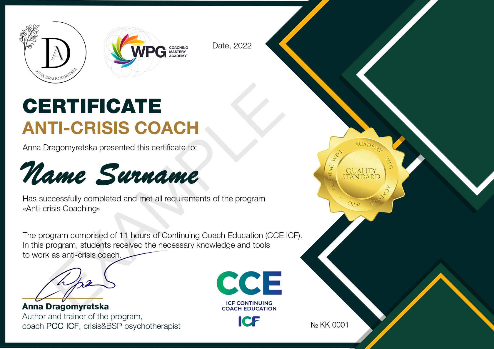 Кроме того, профессиональные коучи, которые пройдут обучение по пакету "Антикризисный коуч", по завершению программы и прохождению тестирования, получат международный сертификат ССЕ ICF о приобритении специализации "Антикиризисный коуч".